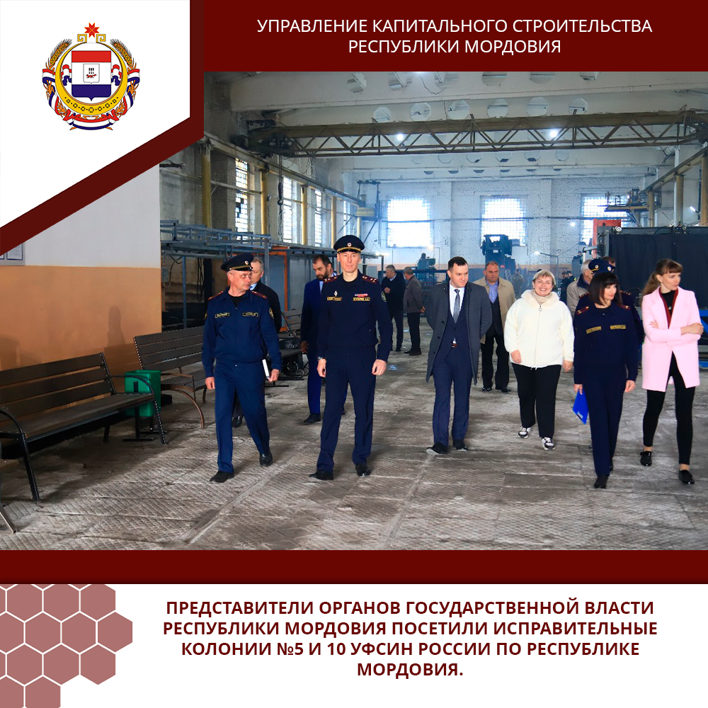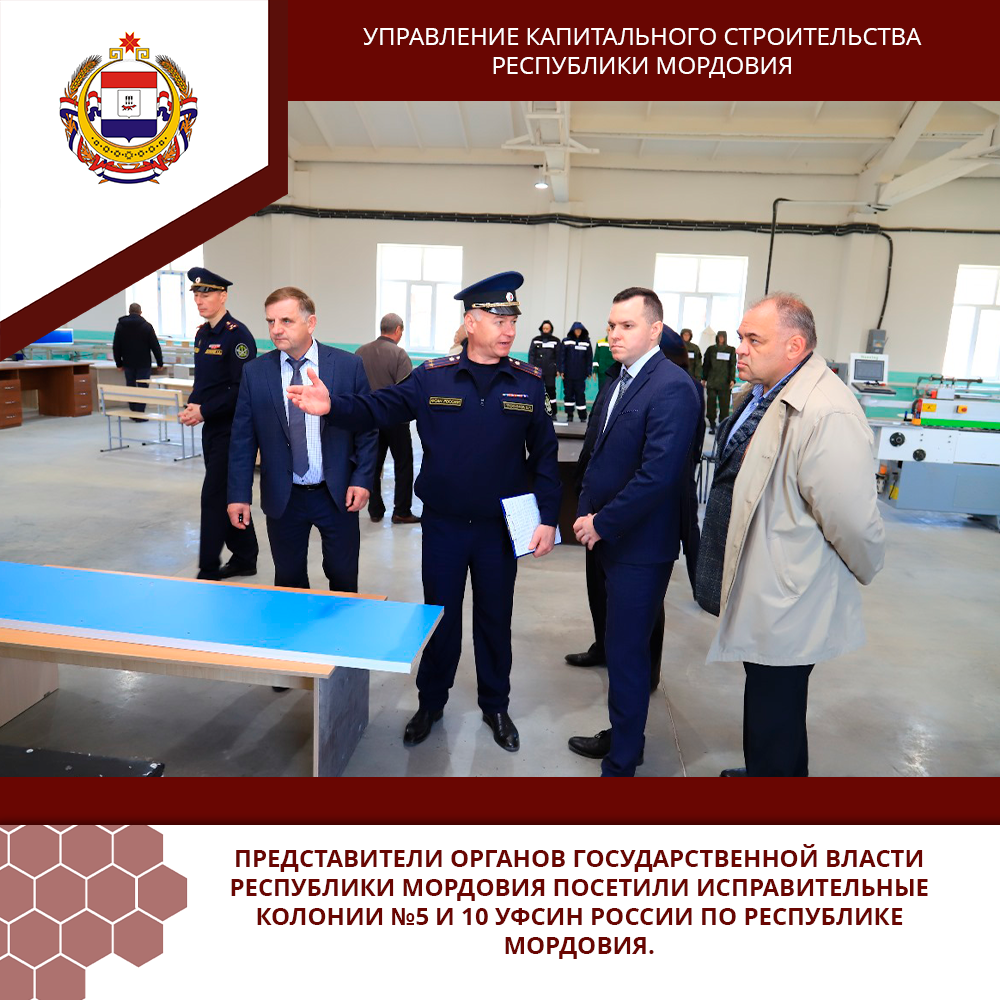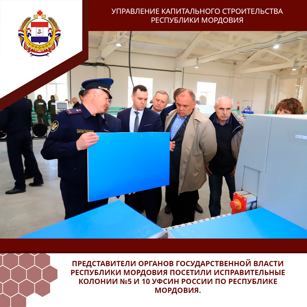 Представители органов государственной власти Республики Мордовия посетили исправительные колонии №5 и 10 УФСИН России по Республике Мордовия. В ходе визита делегация, включая начальника ГКУ «Управление капитального строительства Республики Мордовия» Алексея Ермишева, ознакомилась с производственными мощностями исправительных учреждений. Гостям продемонстрировали оборудование металлообрабатывающего цеха, образцы малых архитектурных форм и изделия металлообработки, новый цех по производству мебели, швейный цех, а также цех по производству окон и дверей из ПВХ.